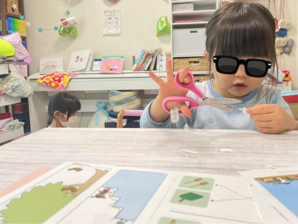 まるちゃんは今日、ハサミを使ってチョキチョキ。ワークを楽しんでいました。まだうまく使えないけど、自分なりにちゃんと切ってるつもり。一生懸命さがかわいい♡