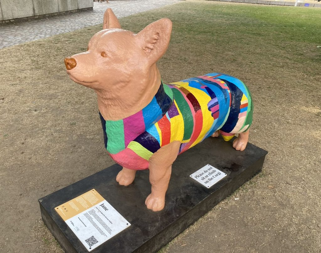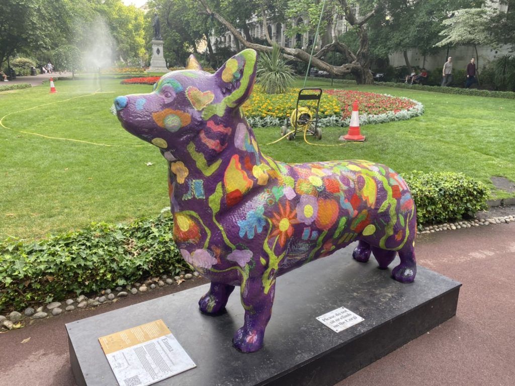 6月にエリザベス女王在位70年を記念した祝賀行事が行われた後、ロンドンの街には女王ゆかりのコーギー犬たちの像が至るところに見られます。