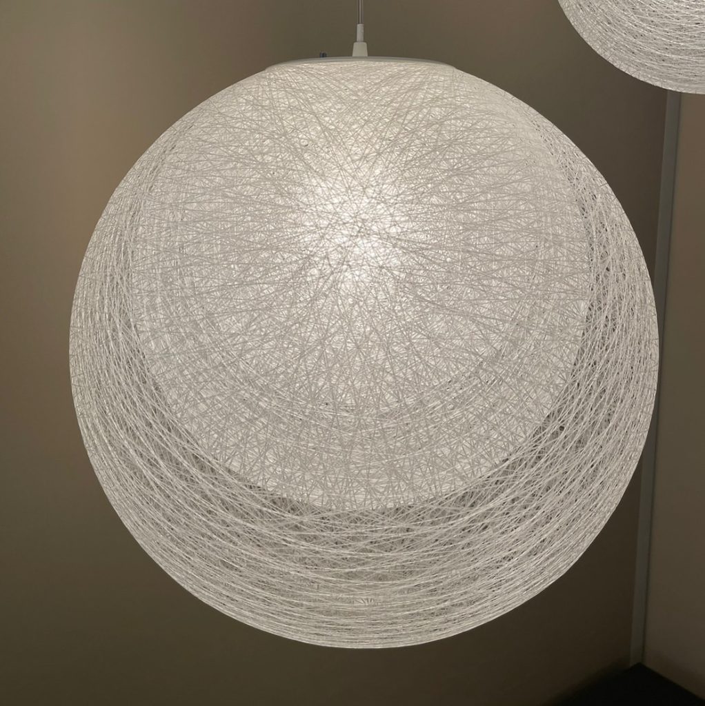 グラスファイバーと透明な樹脂で作られている糸が丸く包み込むような、繭のようなフォルムのペンダントライト 。優しい光が室内に暖かい光を届けます。